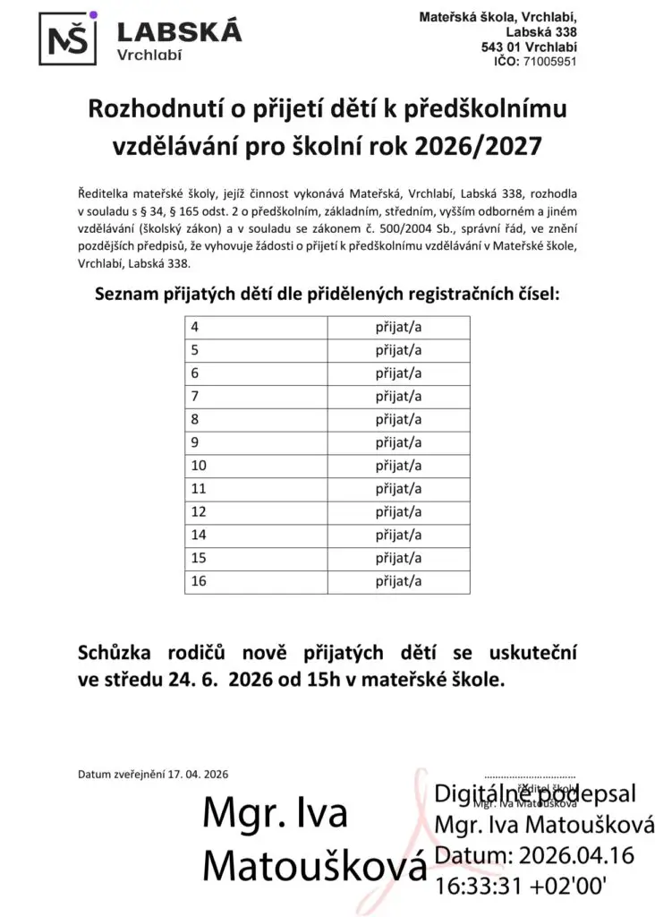 Rozhodnutí o přijetí dětí k předškolnímu vzdělávání pro školní rok 2026/2027